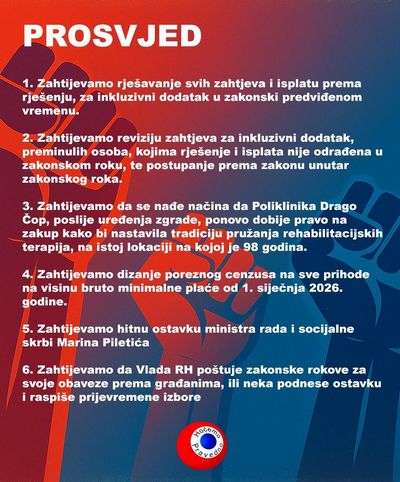 Pozivaju sve građane Hrvatske, umirovljenike i radnike, bolesne i nezbrinute, svih nezadovoljnih zdravstvenom, mirovinskom i socijalnom politikom u našoj zemlji, da podrže najavljeni javni prosvjed.