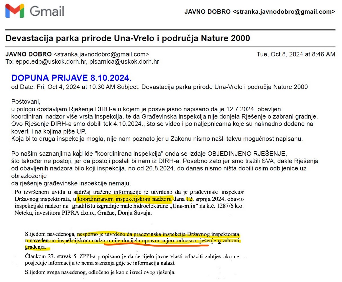 ''Zbog toga i štete koja svakim danom raste novim devastacijama Une i okolne prirode, a na koju su više puta upozoravani da će se dogoditi ako se ne izvrši hitna sanacija prijavljujemo: ministra Branka Bačića i šefa DIRH-a Mikulića jer umjesto čuvanja imovine RH i zaštite najvećih vrednota po Ustavu RH, pravne države i ljudskih prava, osnovano sumnjamo da rade na zataškavanju korupcije i trgovine interesom ili i sami u njemu učestvuju.'', još 4. listopada 2024. godine stranka Javno Dobro obratila se europskom tužiteljstvu i USKOK-u prijavom koju je dopunila odmah potom, 8. listopada nakon zaprimanja Rješenja DIRH-a u kojem je informacija koju smo tražili, inspekcijska rješenja, posebno ono od građevinske inspekcije kojim se zaustavila gradnja, odbijena jer ju nemaju.