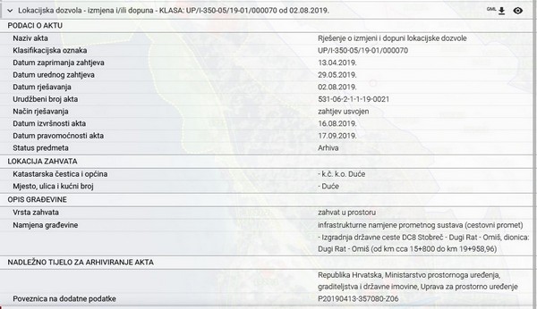 koji sada u opisu građevine kaže da se radi o vrsti zahvata: ''zahvat u prostoru'' i namjeni građevine: infrastrukturne namjene prometnog sustava (cestovni promet). Nema više ni Stobreča, ni Dugog Rata, već se čitav projekt opisuju kao ''zahvat u prostoru'' bez ikakvog pobližeg opisa tog zahvata.