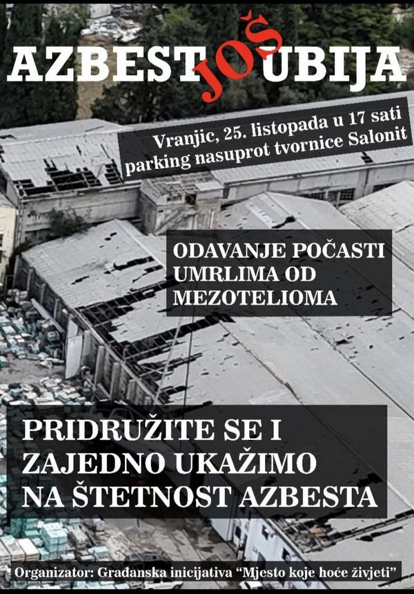 Pozivamo sve građane da podrže ovaj skup i pridruže se na okupljanju koje organizira građanska inicijativa ˝Mjesto koje hoće živjeti˝ iz Vranjica jer ˝Azbest još ubija!˝. Okupljanje je u Vranjicu na parkingu nasuprot tvornice Salonit u 17:00 sati kako bi se odala počast umrlima od mezotelioma te ukazalo na štetnost azbesta. Na ovaj način žele naglasiti kako je potrebno jednom zauvijek dekontaminirati prostor tvornice Salonit i grada Vranjica kako azbest ne bi ostao tihi ubojica i za sljedeće generacije.