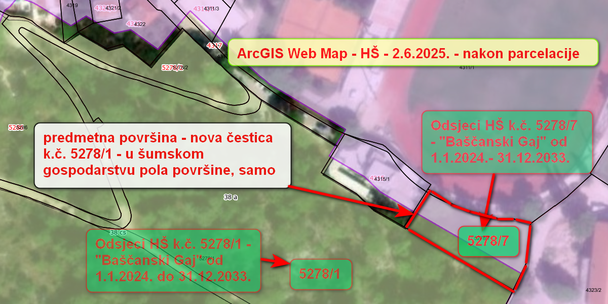 ''Kat.čestica 5278/7 (posjed RH, vlasništvo RH) nastala je u srpnju 2024. godine cijepanjem kat.čestice 5278/1 (posjed HŠ, vlasništvo RH).''