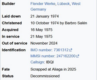 Na Wikipedijinim stranicama kompanije Moby Lines uz kratku povijest kompanije objavljeno je i stanje njihove flote. Pod rubrikom ''Bivša flota'' (''Former fleet''), na zadnjem mjestu nalazi se vrlo jasna informacija o njihovom brodu: Moby Drea (2003.-2025.) Prodano u staro željezo 2025. godine. (Sold for scrap in 2025)