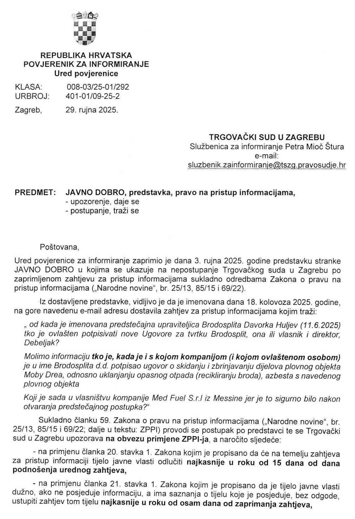 Odgovor stranci Javno Dobro od Trgovačkog suda nije došao u zakonom propisanom roku pa je u ''slučaj'' 3. rujna 2025. uključena i povjerenica za informiranje s molbom za pomoć u ishođenju tražene informacije. Danas, 6. listopada stigao je dopis od povjerenice za informarinje na e-mail adresu stranke. Kada će Trgovački sud dostaviti odgovor na pitanje ''Tko je, kada je i s kojom kompanijom u ime Brodosplita d.d. potpisao ugovor o zbrinjavanju azbesta?'' vidjet ćemo, no Povjerenica za informiranje mu je u svom dopisu od 29. rujna naložila: