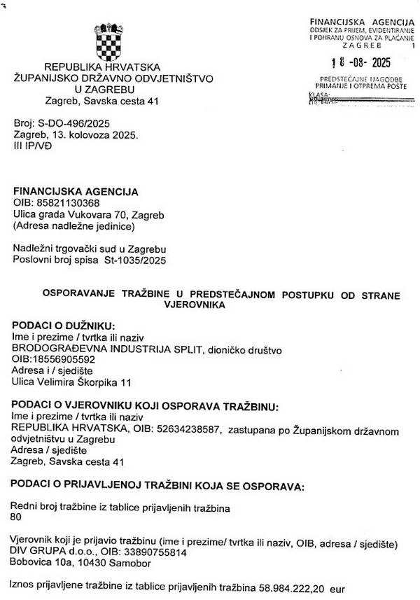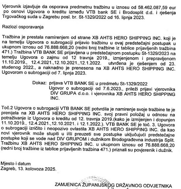 Državno odvjetništvo je u kolovozu osporilo nekoliko takvih potraživanja, od kojih je od DIV Grupe u iznosu od 58.984.222,20 eura posebno interesantno jer se ''duplić'' ne nalazi samo u Brodosplitovom predstečajnom postupku St-1035/2025 i kod drugog vjerovnika XB AHTS HERO SHIPPING INC. već i u onom od DIV Grupe pod brojem St-1329/2022. kod vjerovnika VTB banke kojoj je dug podmiren i prije zatvaranja sada poništenog i vraćenog predstečajnog postupka na ponovno odlučivanje.