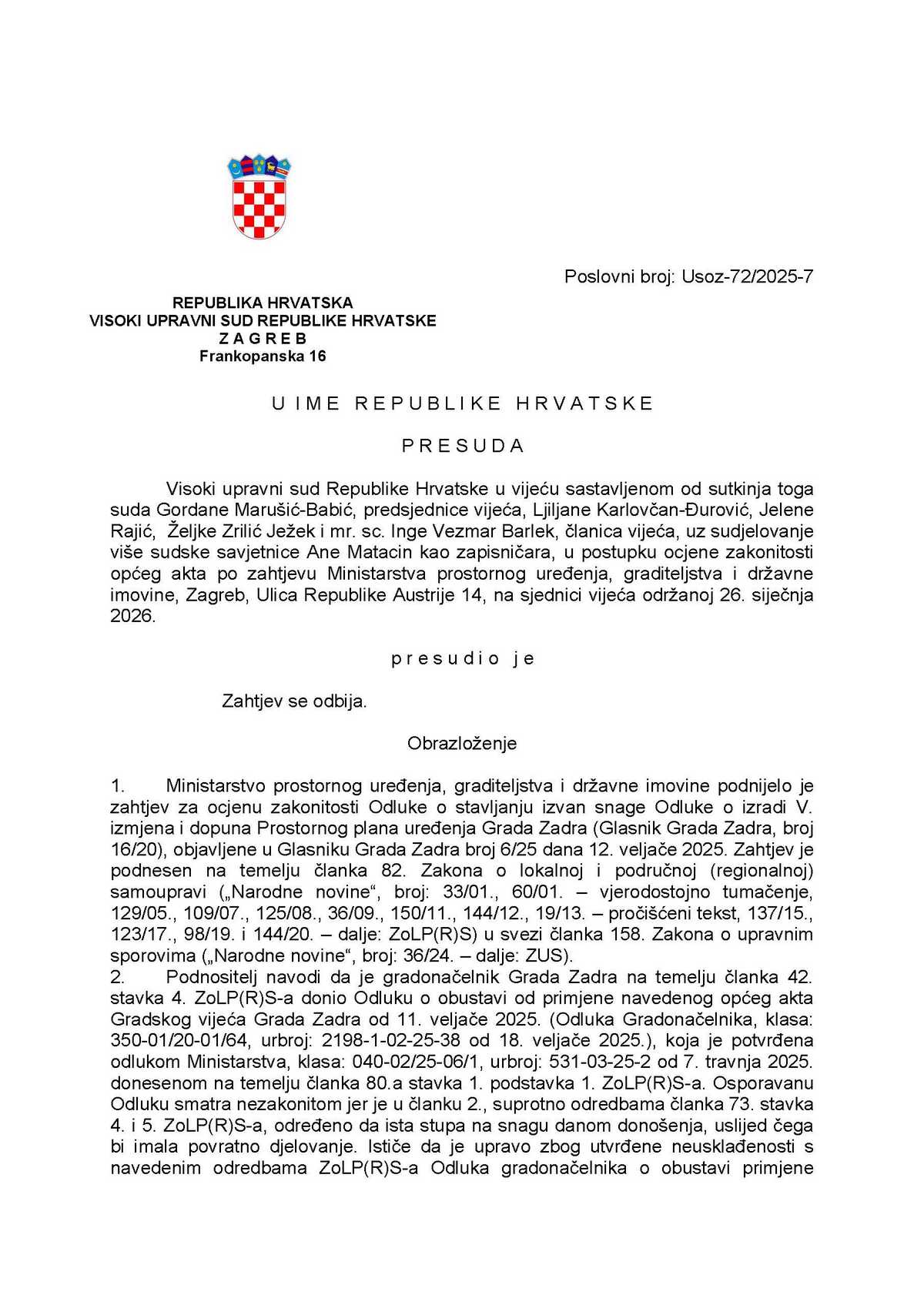 Kao bivšoj vijećnici većine u prošlom sazivu gradskog vijeća drago mi je što je u presudi 26. siječnja 2026. Visoki upravni sud dao za pravo nama, tadašnjoj oporbi u GV Zadar, koji smo prije raspisivanja lokalnih izbora u veljači prošle, 2024. godine glasovali za ukidanje Odluke o V. izmjenama prostornog plana Grada Zadra.