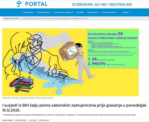 Zakon o zbrinjavanju otpada u staru vojarnu Čerkezovac uz sliv Une, dakle u pograničnom području s Bosnom i Hercegovinom - Očekivani međunarodni incident zbog ''radioaktivnog'' zakona izglasanog 15.12.2025. u Saboru. Slijedi prijava Hrvatske Europskoj komisiji od strane Bosansko-hercegovačkih vlasti zbog nepoštivanja Direktiva i najava velikih pravnih problema sa susjednom nam državom.Jedino me smeta što pričaju kako to ''Hrvatska'' radi, a ne radi, radi Andrej Plenković i njegova HDZ-ova Vlada uz pomoć HDZ-ovaca u Saboru RH,