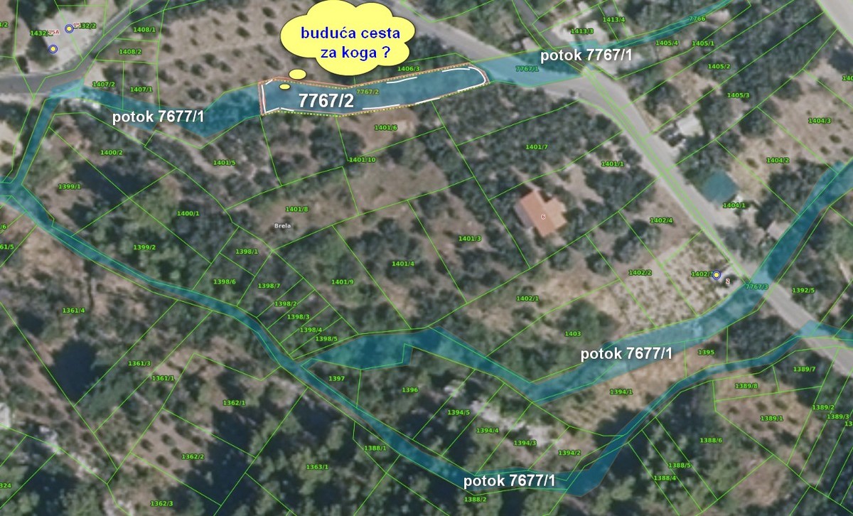 Naime, u području P4, zelenom i poljoprivrednom važeći prostorni plan općine Brela ne omogućava nove gradnje, nema ni puteva. Pa tako neunovčiv i neizgrađen predstavlja zelenu oazu bez cesta, tek s potokom koji skuplja i kanalizira navalne oborinske vode s Biokova. Iste vode koje su nedavno prouzročile ogromnu štetu u Podgori. Stoga je važnost održavanja takvih potoka kroz podbiokovska mjesta danas jasna svima, mislili smo. Kao i neizgrađene, zelene i ''vodoupijajuće'' površine u naseljima. Informacijski sustav prostornog uređenja stoga posebno označava takve potoke, no na pregledu ISPU-a u Brelima događa se anomalija, parcelacija i izdvajanje čestice potoka 7767/2 odmah do postojeće prometnice od ostalog dijela plave boje, no sada prekinutog i podijeljenog u dvije katastarske čestice 7767/1 i 7767/3.