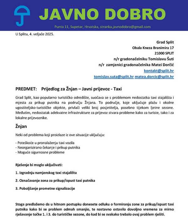 Stranka Javno Dobro uputila je ovo pismo-prijedlog gradonačelniku Tomislavu Šuti i zamjenicama 5. veljače 2026.: